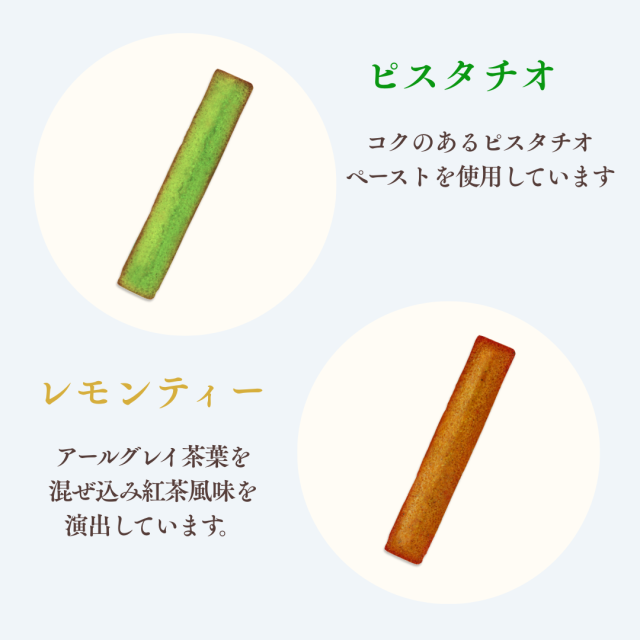しっとりとした食感のフィナンシェを食べやすいスティック型にしました。プレーン、ピスタチオ、ショコラ、ストロベリー、レモンティーと種類も豊富にそろえたギフトセット。ご友人・知人へのお手土産やちょっとした贈り物におすすめです。