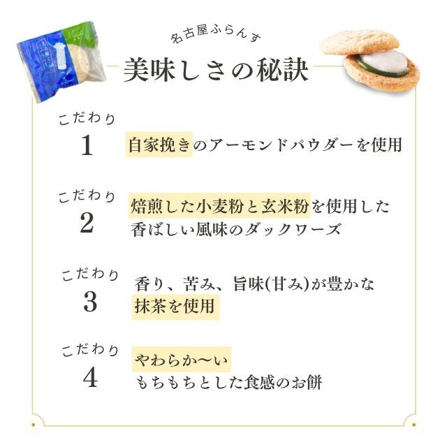 和菓子の代表格「おもち」をフランス生まれのおしゃれな焼菓子「ダックワーズ」でサンドした 軽い食感と、本格的な美味しさが 「名古屋ならでは」と大人気。